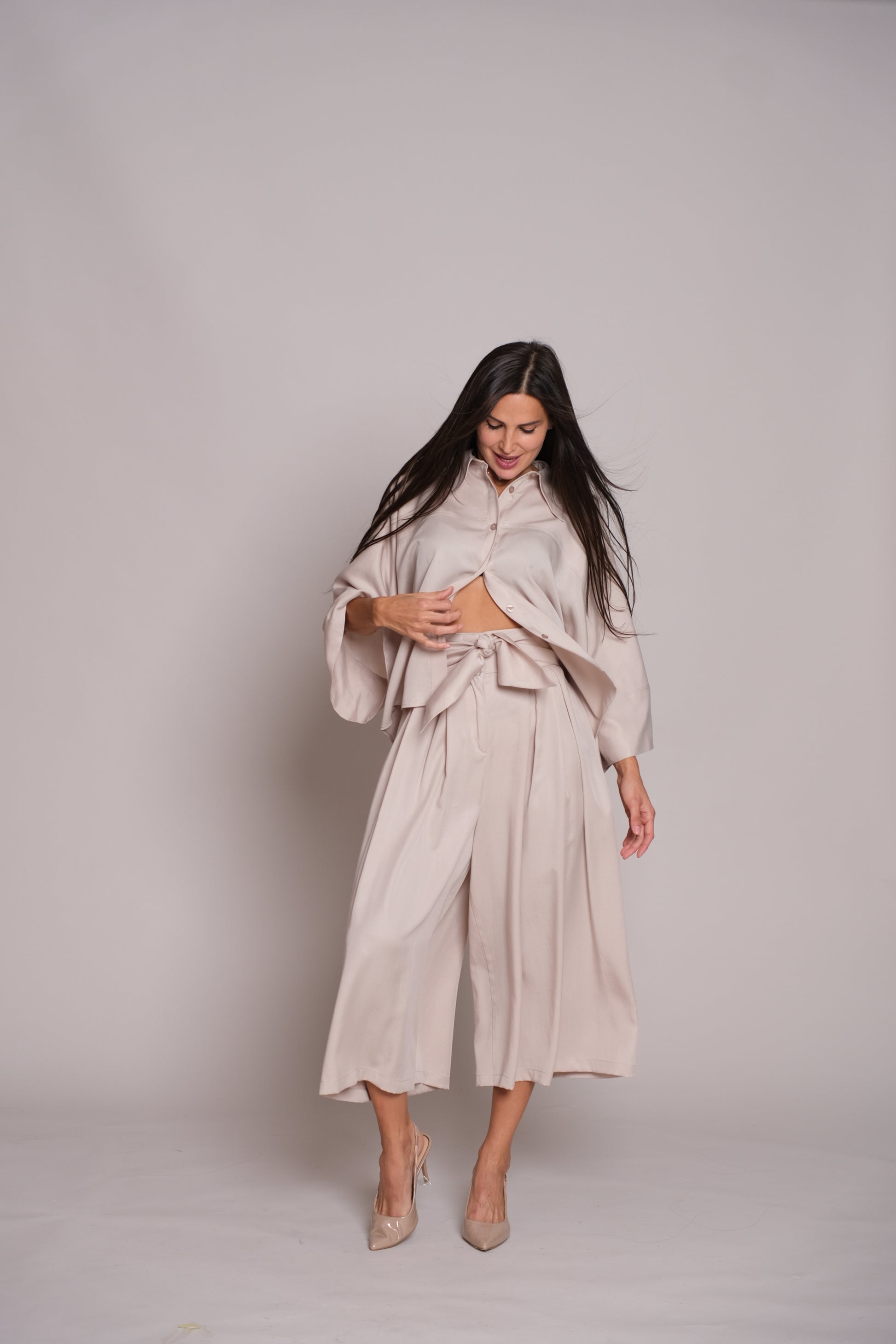 Redefine elegance with the Flair Trousers Beige. Featuring a high-waist design and wide-leg silhouette, they are crafted in a culottes-inspired style, giving the graceful look of a skirt with the comfort of trousers. The soft beige tone makes them endlessly versatile – perfect for office chic, weekend outings, or sophisticated evenings.