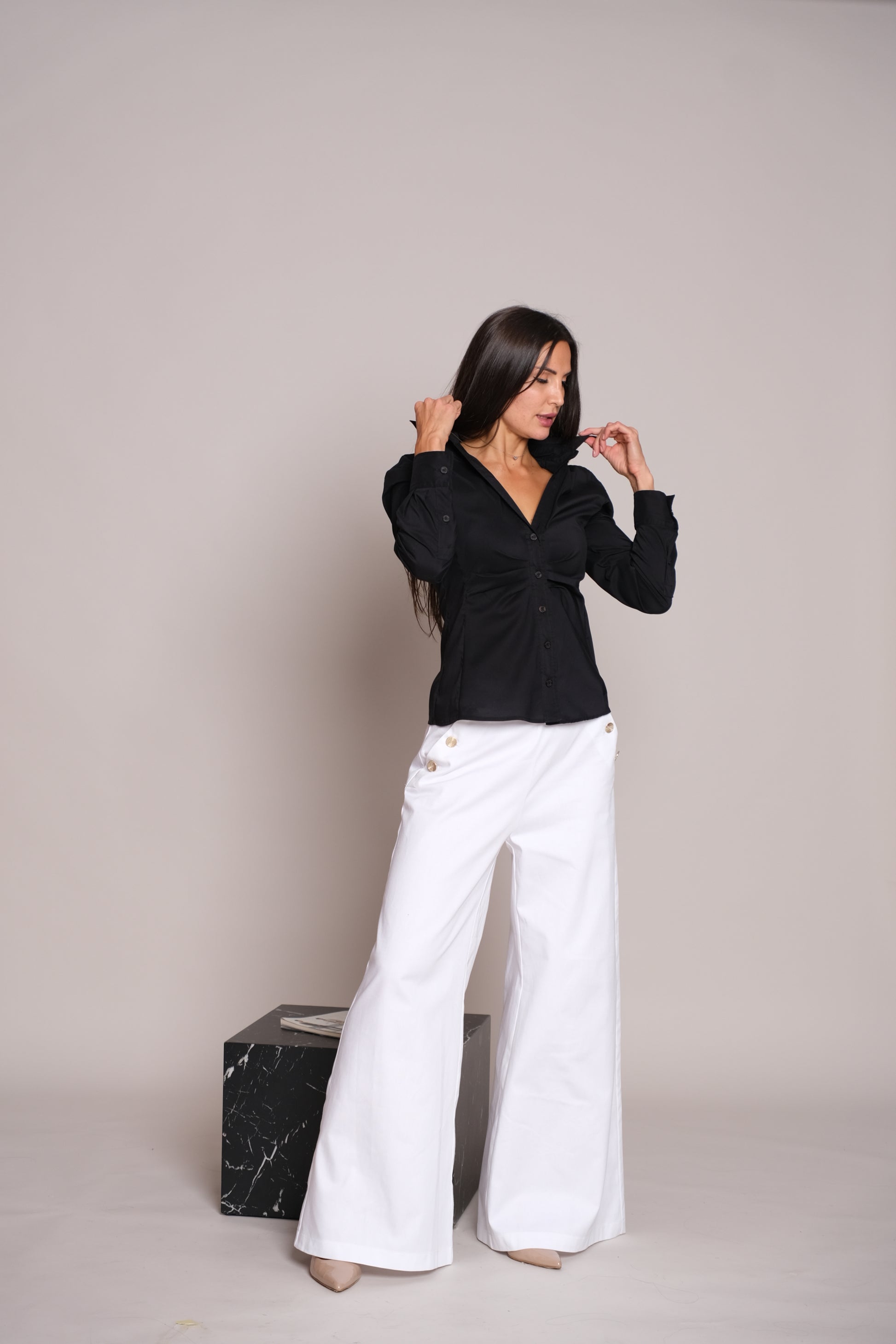 Elevate your wardrobe with the timeless elegance of the Sun Shirt Black. Tailored in classic white, it features a refined V-shaped neckline that elongates the silhouette and adds a touch of sophistication. The cinched waist creates a flattering, feminine shape, balancing sharp tailoring with graceful lines. Effortlessly chic and endlessly versatile, this shirt transitions seamlessly from power dressing to evening elegance.