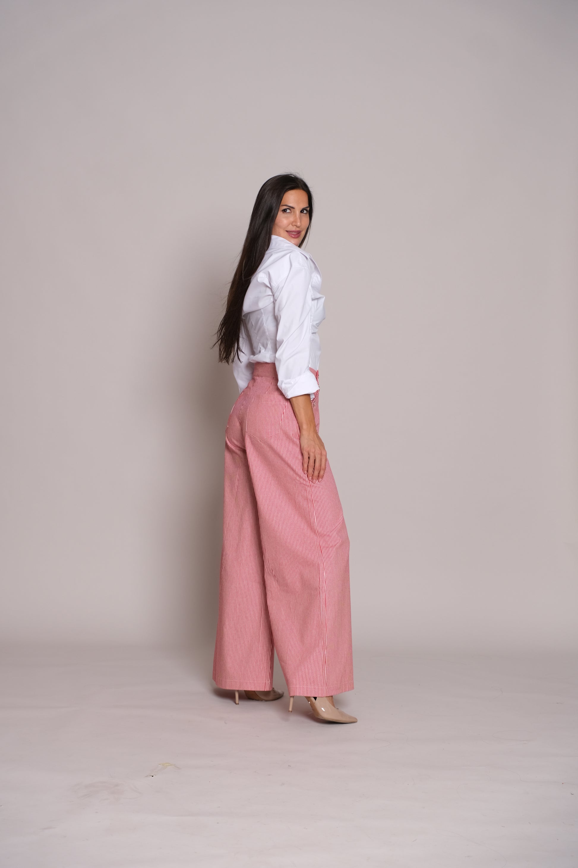 Step into effortless sophistication with the Skyline Trousers Red Stripe. Designed with a flattering high waist and flowing wide-leg silhouette, they create an elongated, graceful look while ensuring everyday comfort. Distinctive button accents on both sides of the waist add a touch of refined detail, elevating these trousers from staple to statement. In a red stripe tone, they transition seamlessly from professional chic to evening elegance.
